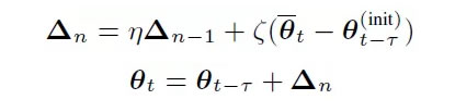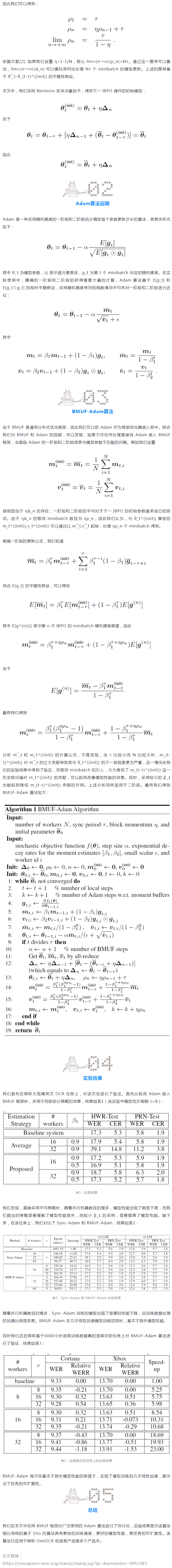 在基于 BMUF 的訓(xùn)練框架下,假設(shè)我們總共有 N 個并行工作機(jī),一個工作機(jī)可以是一塊或多塊 GPU 卡,也可以是一個計(jì)算節(jié)點(diǎn)。給定一個包含 Nτ 個 minibatch 的訓(xùn)練數(shù)據(jù)子集,首先我們將這些數(shù)據(jù)均勻分布到 N 個并行工作機(jī),每臺工作機(jī)獲得 τ 個 minibatch。從一個共同的初始模型 θ_(t-τ)^((init)) 開始,N 個工作機(jī)獨(dú)立更新各自的局部模型 τ 步,得到 {θ_(t,1),θ_(t,2),…,θ_(t,N)},對局部模型取平均得到 θ ̅_t。這一過程稱之為數(shù)據(jù)塊內(nèi)并行優(yōu)化(Intra-Block Parallel Optimization, IBPO)。與直接將 θ ̅_t 作為全局模型不同,BMUF 技術(shù)將歷史更新信息與當(dāng)前更新信息結(jié)合,得到全局模型: