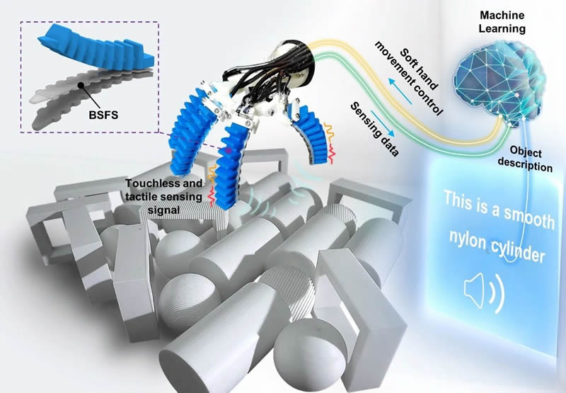 在人類感知世界的過程中,皮膚的多模態(tài)感知為我們感受真實的物理世界提供了重要的工具。正如人們用手指觸摸未知的物品,當具有多模態(tài)感知能力的機器人手摩擦未知物品時,機器人便能感知到物品的粗糙度;當機器人手隔空拂過位置物品時,它甚至能像X射線和3D掃描儀那樣感知到物品的材質(zhì)和形狀。因此,能夠感知環(huán)境的多模態(tài)傳感與擅長交互的軟體機器人的結(jié)合必然能擦出火花。