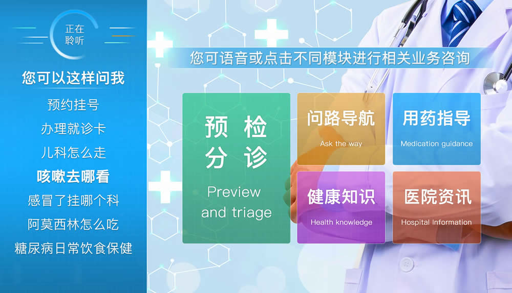 | 智能導(dǎo)診機(jī)器人開發(fā)初衷是解決門診導(dǎo) 醫(yī)人數(shù)較少、重復(fù)問答較多的現(xiàn)實(shí)情況。在醫(yī) 院業(yè)務(wù)G峰期人滿為患的情況下,智能醫(yī)療 服務(wù)機(jī)器人可以及時(shí)響應(yīng),可以指導(dǎo)患者就 醫(yī)、引導(dǎo)分診,同時(shí)向患者可以介紹醫(yī)院就 醫(yī)環(huán)境、門診就診流程和醫(yī)療保健知識(shí)等。 導(dǎo)診機(jī)器人通過語音識(shí)別、語音合成和自然 語言理解等技術(shù),支持語音、觸控、圖像等 多種交互方式,改善就醫(yī)體驗(yàn),提G醫(yī)療服 務(wù)質(zhì)量,是醫(yī)院智慧醫(yī)療的重要組成部分和 具體體現(xiàn)。 |